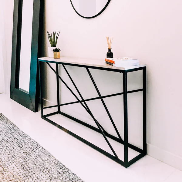 A sleek modern console table with a sintered stone top and sturdy metal frame. Ideal for hallways, entryways, or compact living spaces.